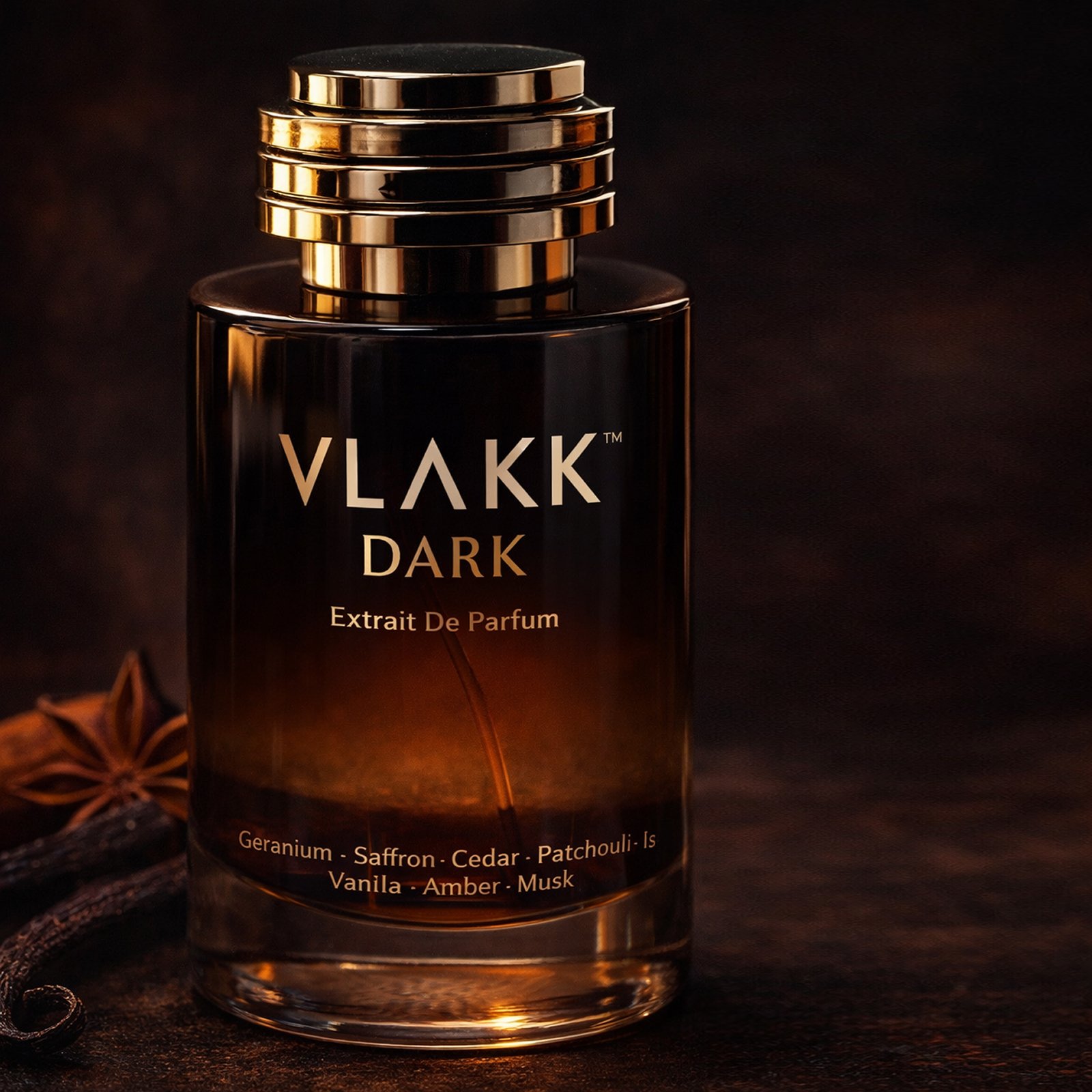 VLAKK™ Dark opens with a striking blend of Geranium and Saffron, creating a warm, spicy floral introduction that feels exotic and instantly captivating. As the fragrance evolves, a rich heart of Cedar, Patchouli, and Iris adds depth, earthiness, and a velvety floral sophistication. Finally, the scent settles into a sensual base of Vanilla, Musk, and Amber, giving Dark its signature sweet‑musky oriental finish.