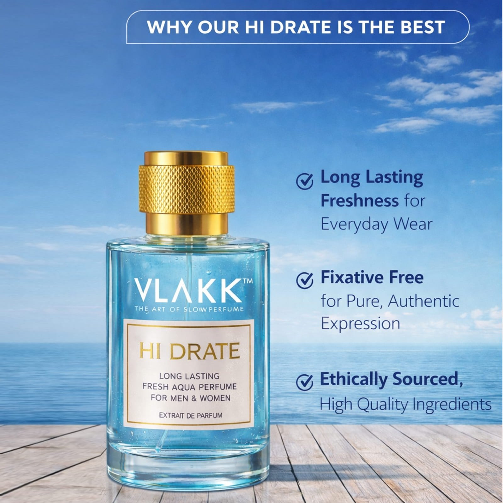 Formulated with dermatologically safe ingredients, VLAKK™ Hi‑Drate ensures smooth, irritation‑free wear. Its balanced composition prevents dryness and allows the fragrance to settle naturally on the skin.