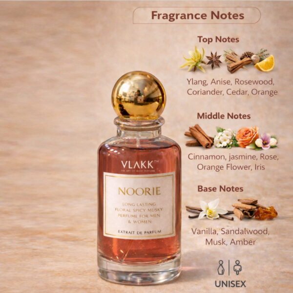 VLAKK™ Noorie opens with an enchanting blend of Ylang, Anise, Rosewood, Coriander, Cedar, and Orange, creating a floral‑spicy introduction that feels warm, exotic, and instantly intriguing. As the fragrance evolves, a lush heart of Cinnamon, Jasmine, Rose, Orange Flower, and Iris adds depth, sensuality, and a velvety floral richness. Finally, the scent settles into a comforting base of Vanilla, Sandalwood, Musk, and Amber, giving Noorie its long‑lasting, soft‑musky signature.