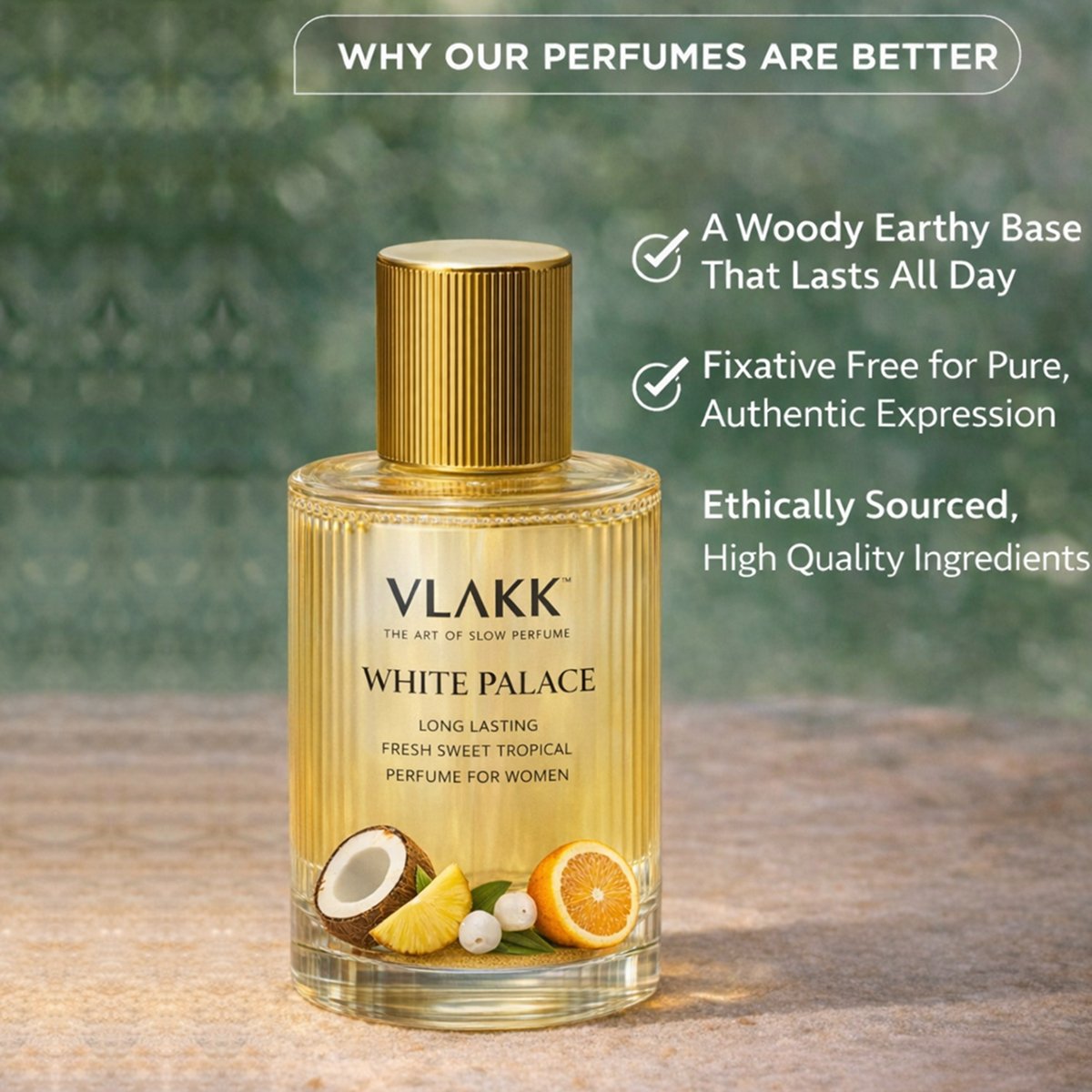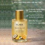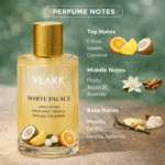 Unlike many commercial perfumes that rely on synthetic fixatives, VLAKK™ White Palace is fully fixative‑free, allowing each note from the sweet‑tropical opening to the creamy woody finish — to express itself with clarity. Longevity comes from high‑quality aromatic ingredients rather than artificial boosters.